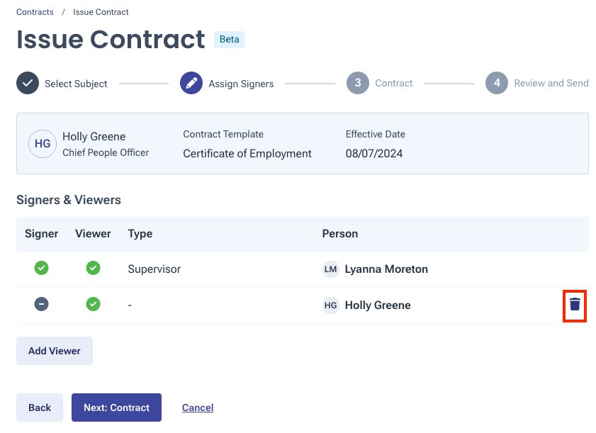 - Issuing a Contract: We've made a slight change to issuing contracts. If the subject of a contract is not a signer, they will be automatically added as a viewer. You can remove them as a viewer by selecting the "Remove" Symbol