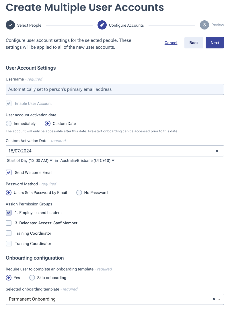 - Bulk User Creation: To further improve Onboarding for our customers, we've added the new Onboarding options to the Create Multiple User Accounts page. You will now be able to assign a future dated account activation date and onboarding form template in bulk.