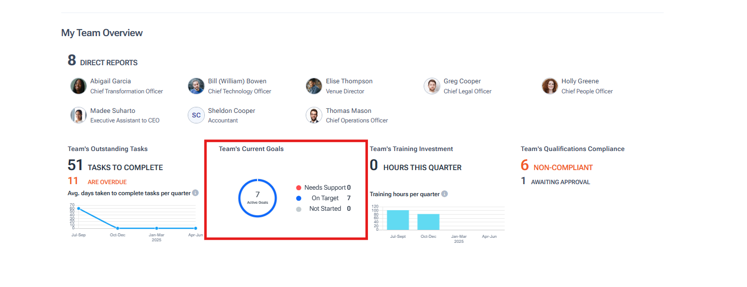 ✅ Leaders with direct reports can view their team’s active goals through the Team’s Active Goals Overview, located on their dashboard.
