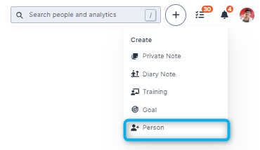 You can also quickly begin the onboarding process by Creating a Person quickly via the "Quick Create Menu" (the plus icon at the top right-hand of the screen).