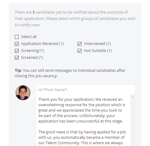 4. Notify unsuccessful applicants of the job outcome by sending messages to applicants based on their status.