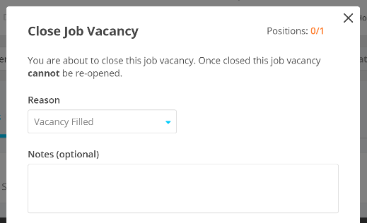 3. In the popup, select your reason for closing the job vacancy and add any additional notes.