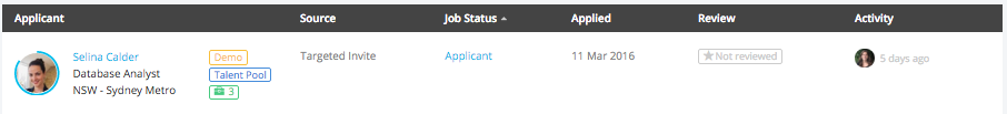 - Application Received: Candidates that have been reviewed, but not had any action taken. (Talent Pipeline Stage: Community)