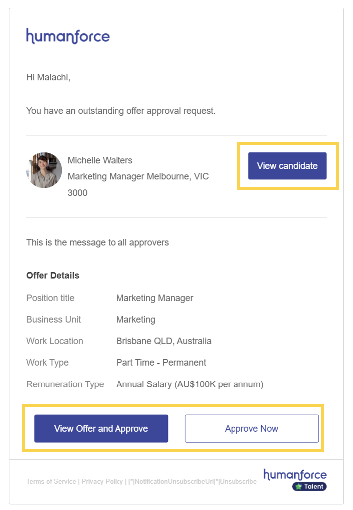 The Offer Letter Approval process begins via an email notification with the subject line Offer approval request for <Candidate Name>. From the email, you can choose to Approve the offer immediately, view the offer details or view the candidate.