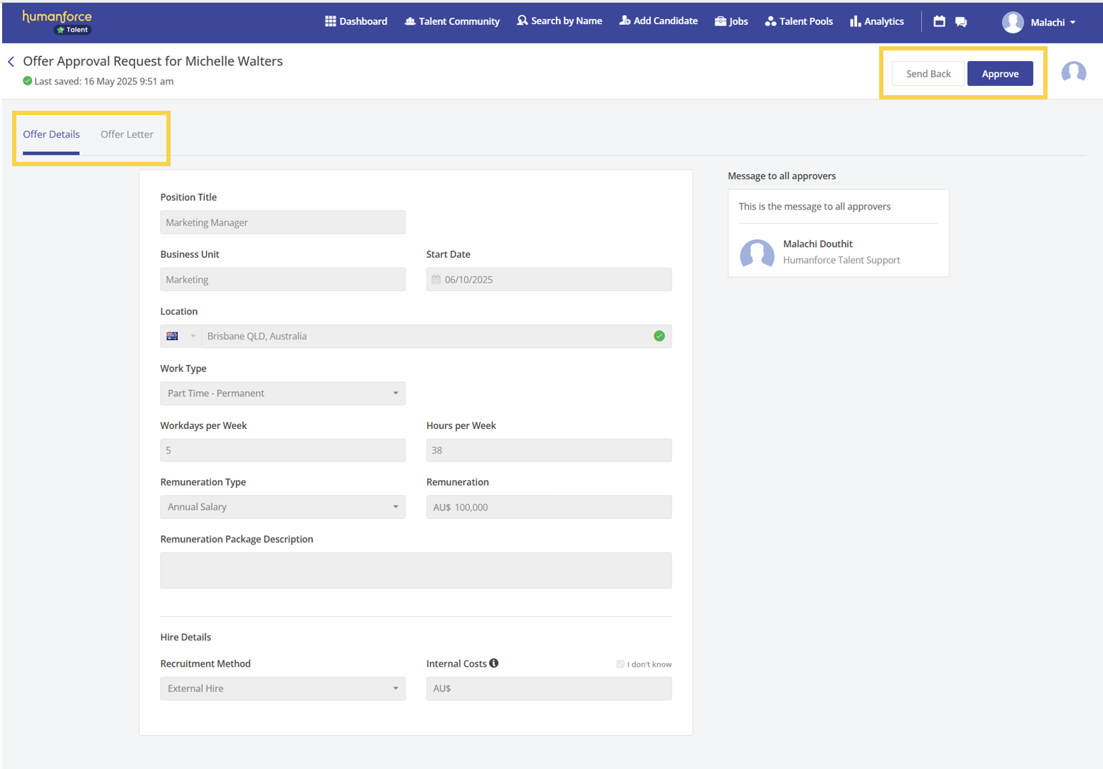 - If the Offer Letter needs to be amended, click the Send Back button and include a note to send the offer back to the user that created the Offer.