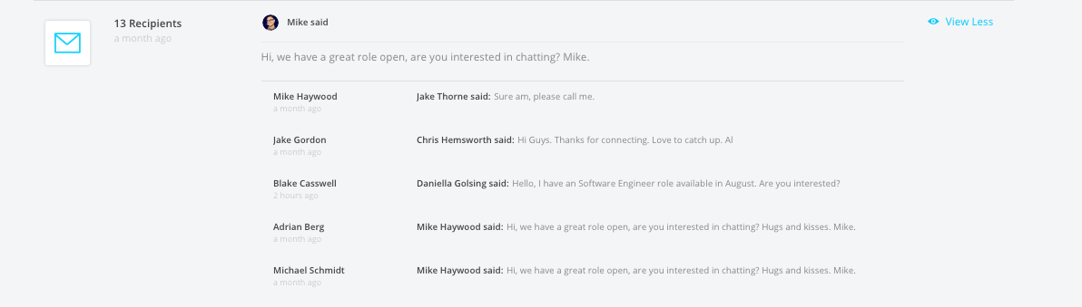 LiveHire's bundled bulk message feature allows you to easily view the individual messages side by side within a sent bulk message.