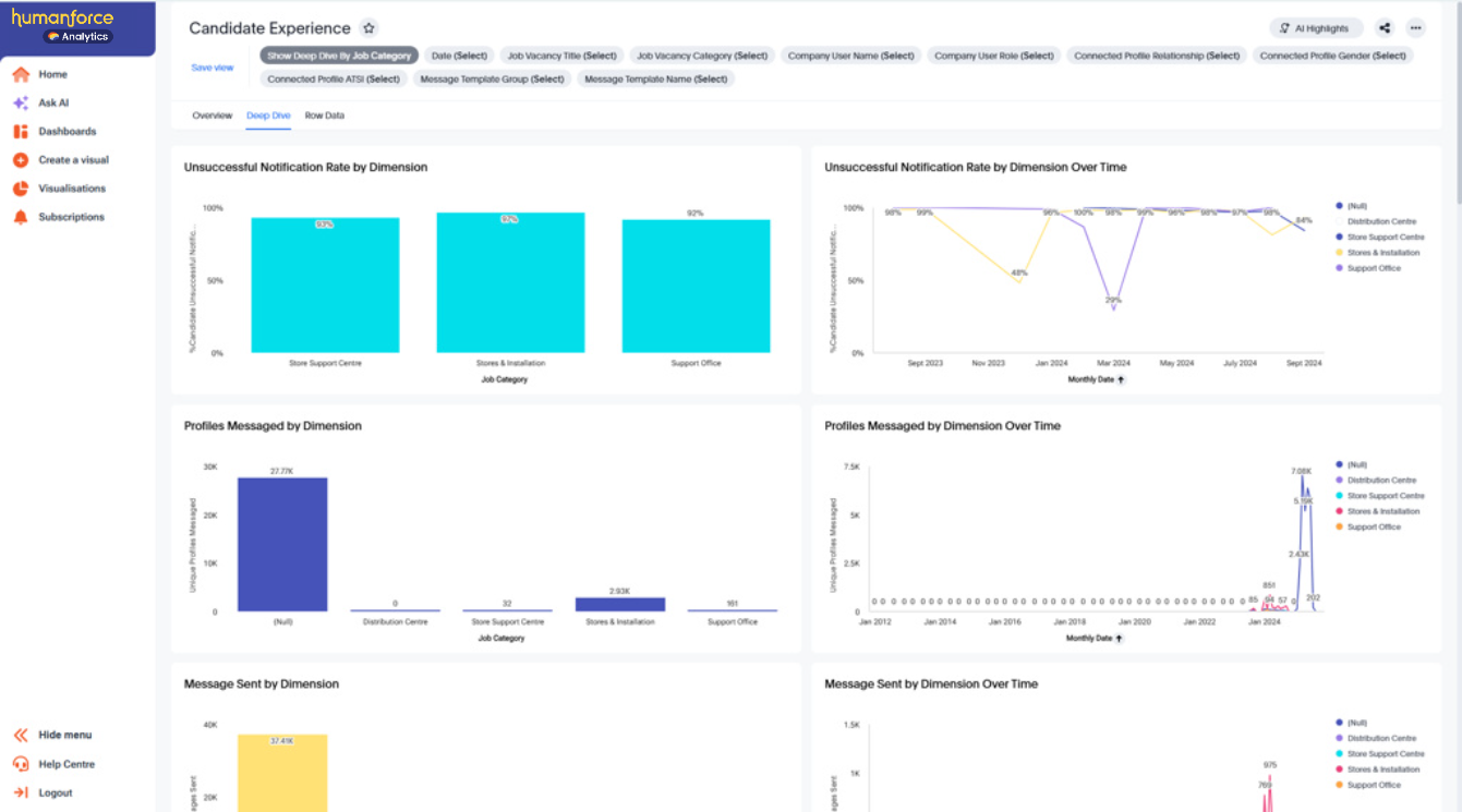 These filters give you flexibility to tailor the dashboard to specific roles, candidate demographics, or communication types, making it easier to uncover actionable insights.