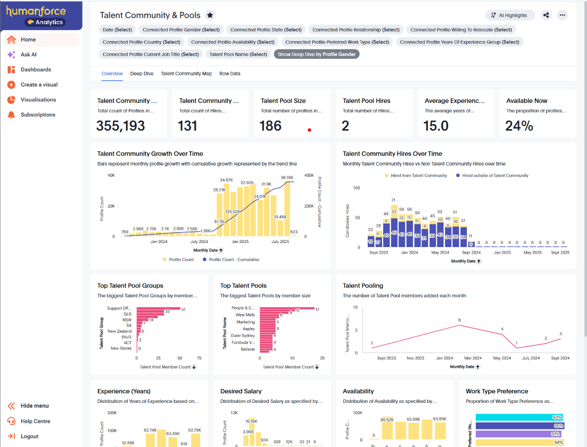 If you have previously used the Talent Community Overview dashboard in Humanforce Talent, you will find similar data and metrics here.