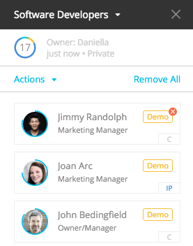 Remove Talent from Lists How to Remove a Candidate From Lists: 1. Open your desired List. 2. Navigate to the top right-hand corner of your candidate until a red icon appears. 3. Click the red cross to remove the candidate. Related articles Bulk Actions in Lists My Account is Locked If a candidate calls with a problem, what do I do? Create a dashboard or report schedule for distribution