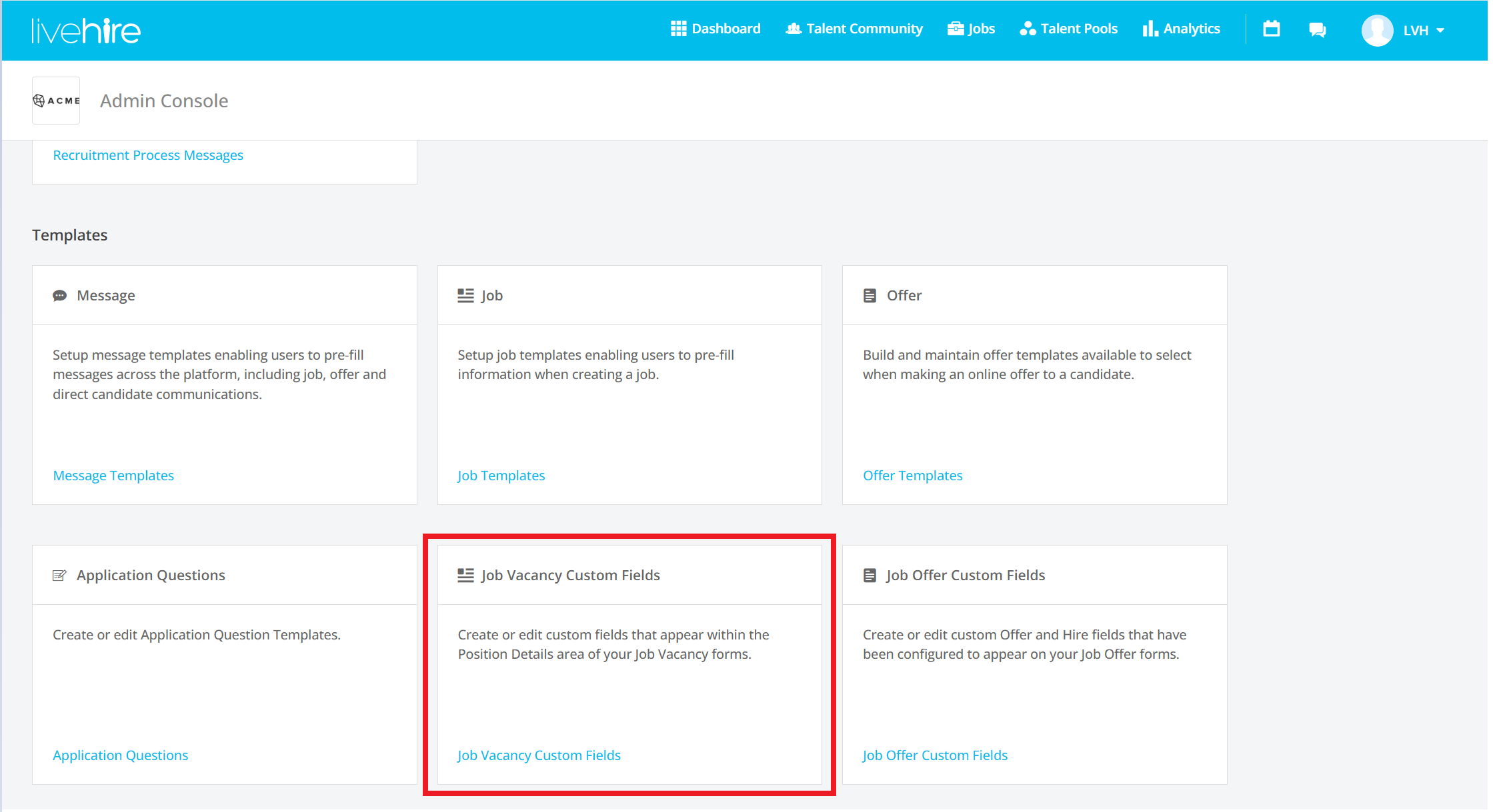 Open the Admin Console and navigate to the tiles that sit below the Templates section. You should see a tile that looks like the image below. Access to the Job Vacancy Custom Fields is set at the user permission level so it may not be available to your User Type even if you're able to access other features within the Admin Console. If you're an Admin level user or believe that you should have access to the Job Vacancy Custom Fields editor but you don't see it, reach out to your Account Director or the LiveHire Support team.