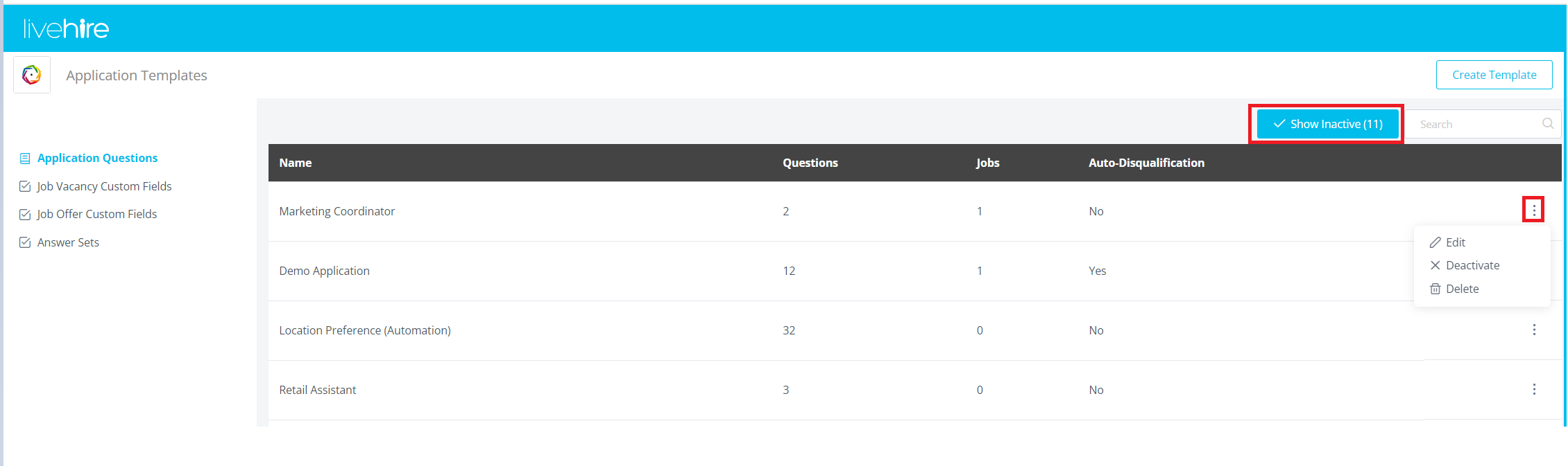 - Deactivate - This will deactivate the Application Question Template. It will no longer be selectable when creating jobs and will be hidden from view when in the Application Question Templates area. You can click the "Show Inactive" button to display and restore deactivated templates.