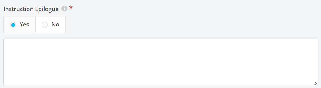 Instruction Epilogue - If you select 'Yes' for Instruction Epilogue, a mandatory text area field will appear. This field supports plain text only and will appear below the Question Label and above the answer field for an applicant.