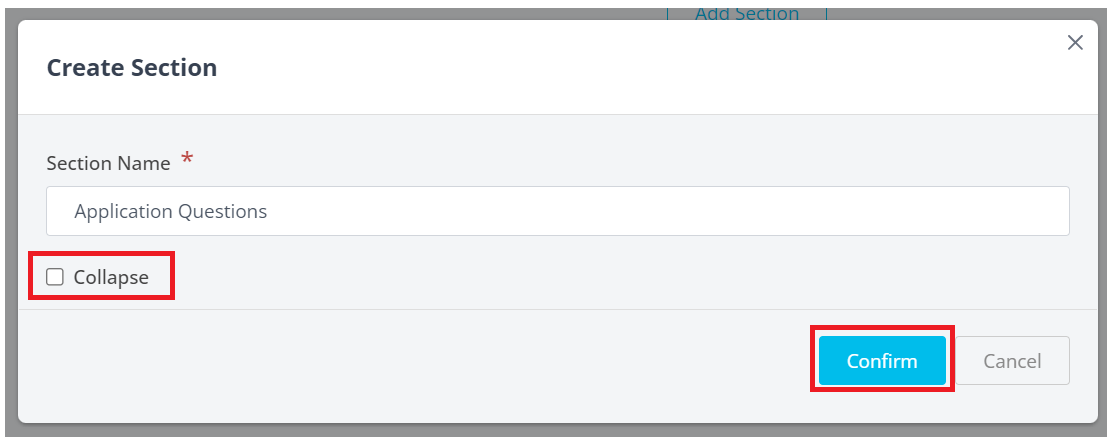 After you've named the Section, you have the option to Collapse the section. If a section is collapsed, your applicants will need to click the + icon to expand it accordion style. This is useful if you have multiple sections but don't want your applicants to abandon the application due to the number of questions that are immediately visible.