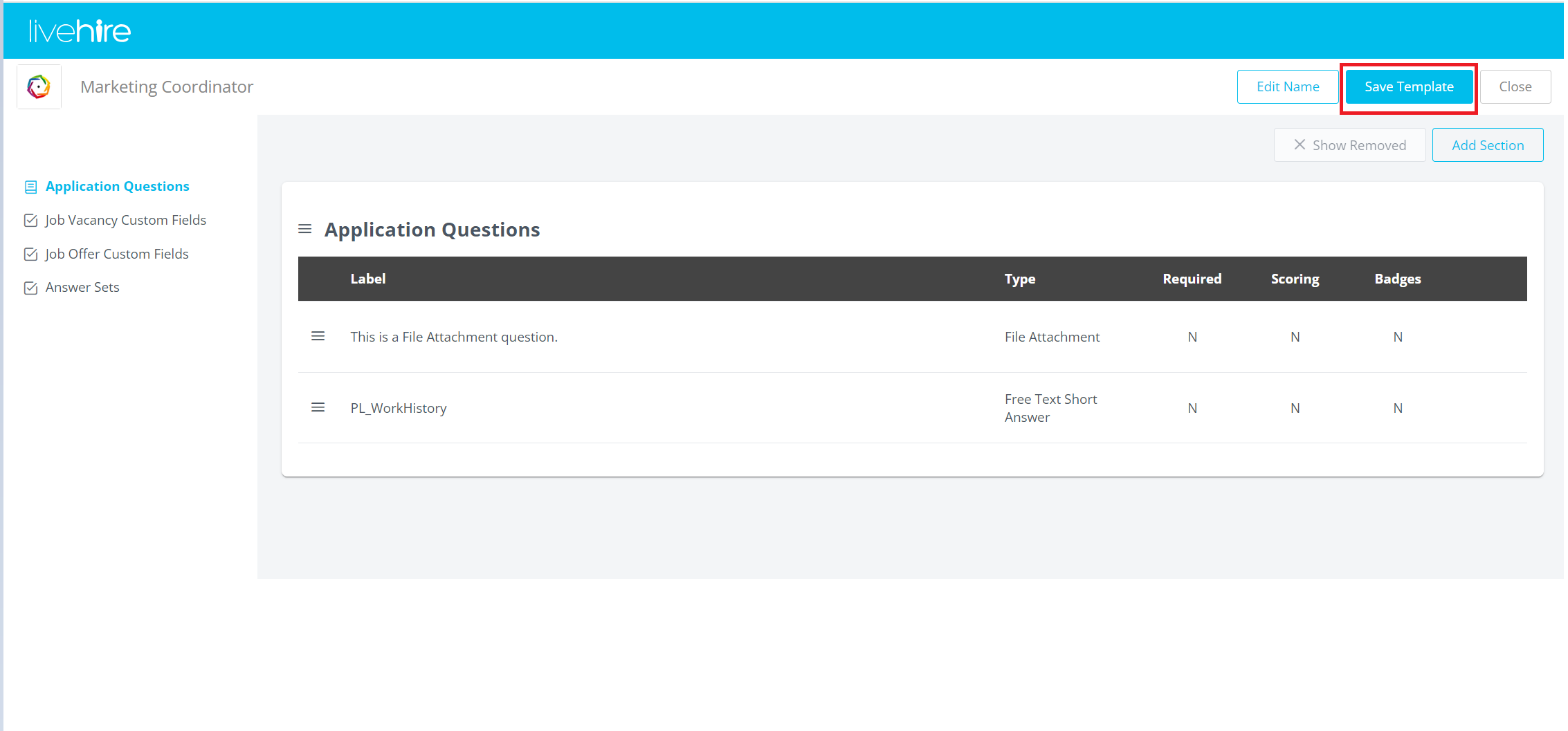 - Once you're happy with your Application Question Template, click the Save Template button. It can now be added to jobs via the Application tab when editing the job details.