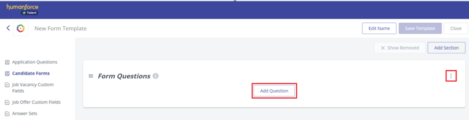 - Now that you’ve added a section, you can begin adding Instructions or Questions. To add your first question, click the Add Question button in the centre of the template panel. Note you can also use the 3-dot icon that appears along the right-hand side to open the editing menu.