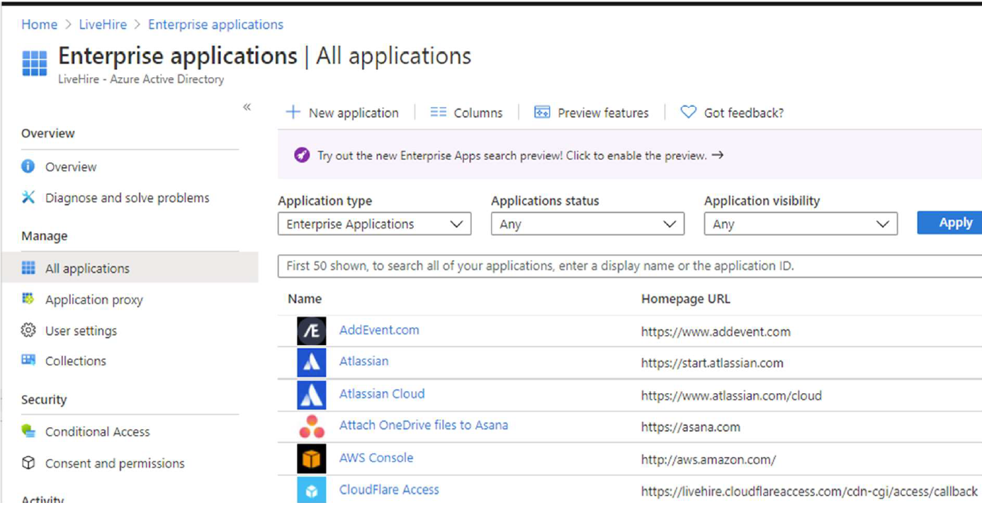 From inside your Azure Active Directory, select “Enterprise applications” on the left-hand side. This will bring up a list of the applications (if any) that you have connected via SSO. Select “New application” from the top bar to begin creating the Humanforce Talent SSO connection: