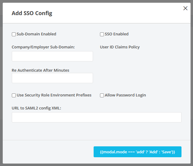 To enable SSO, tick the Sub-Domain Enabled and SSO Enabled boxes, choose your ID Claims Policy and copy/paste your Metadata URL into the URL to SAML2 config XML field and click Add button.