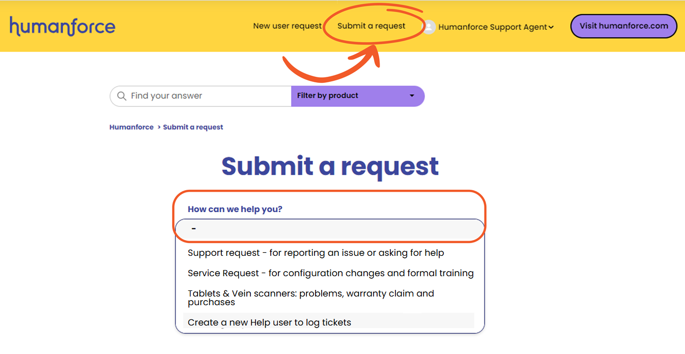 This article shows you how to submit a support ticket through the Humanforce Help portal, including: