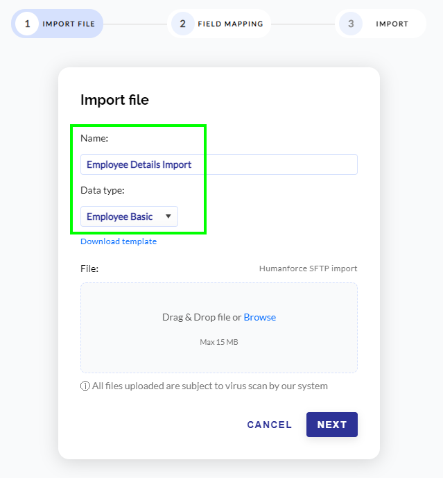 The tool also provides a downloadable template when creating a new import which you can use to create an employee details import file from scratch to meet your needs.