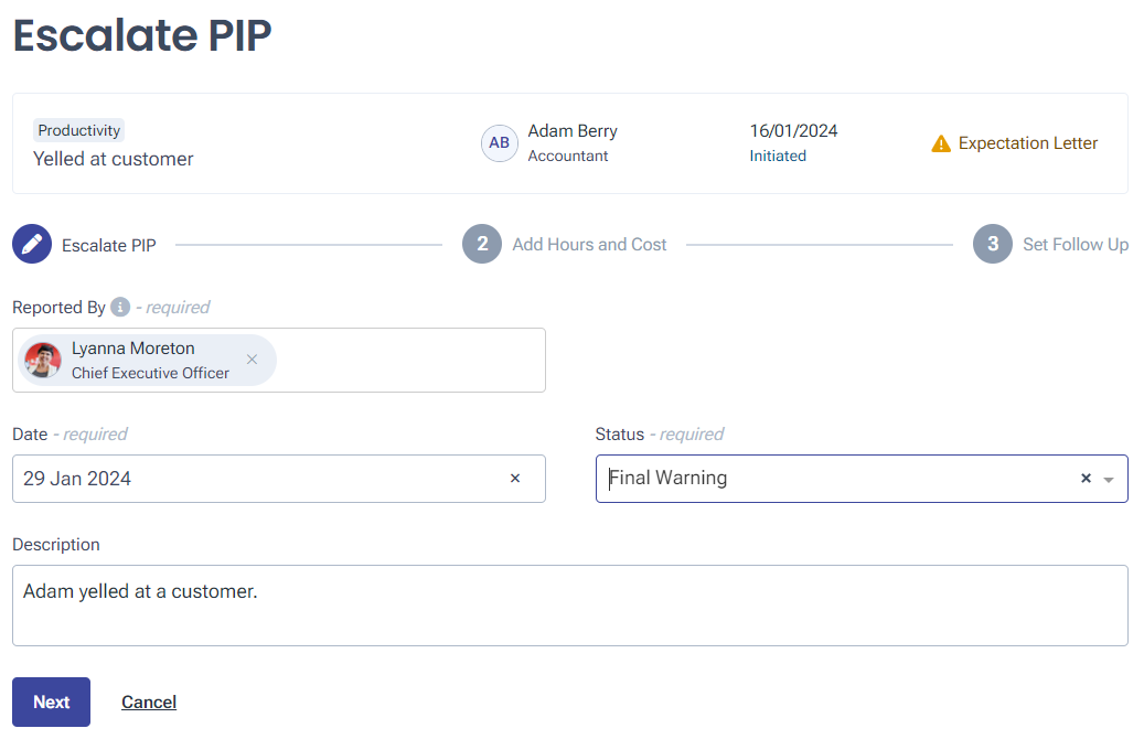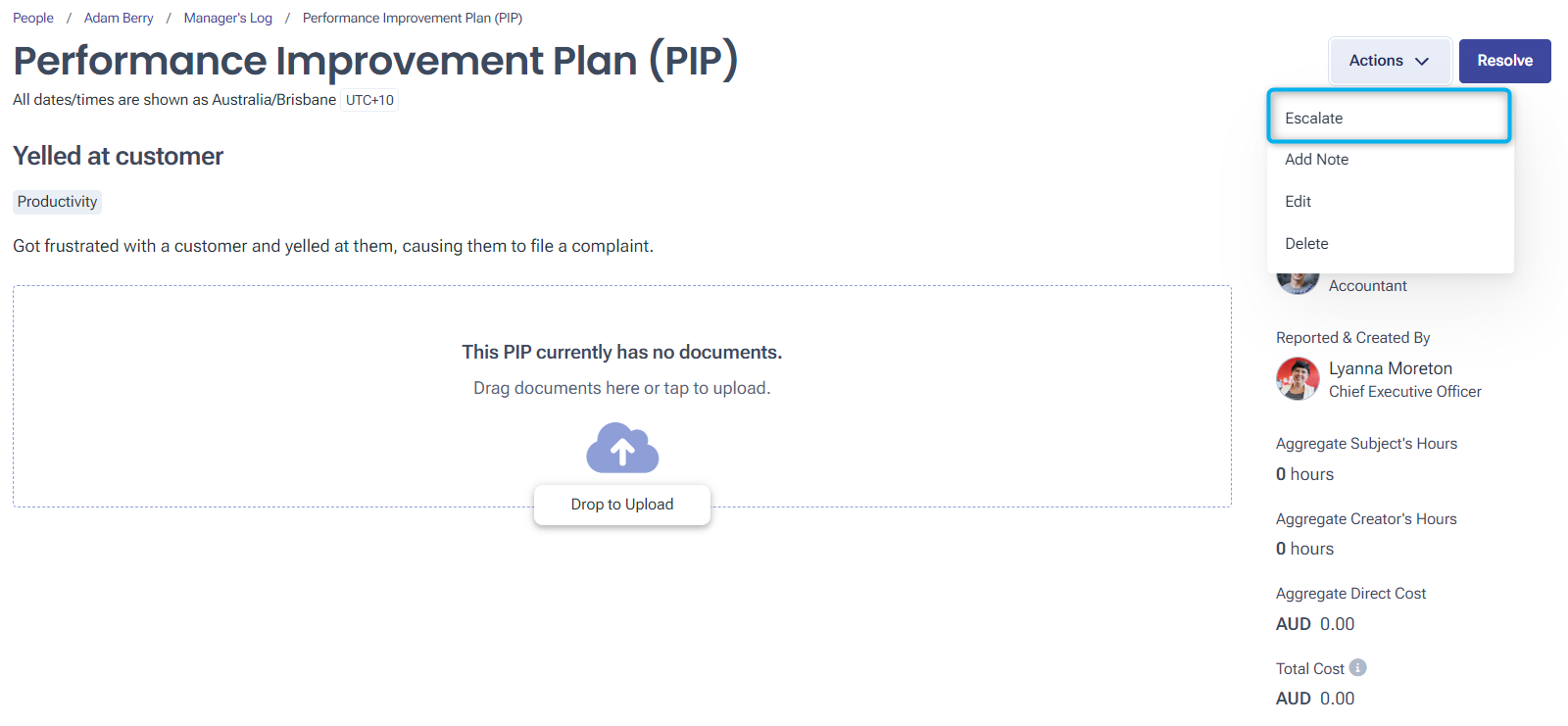 If an employee’s performance is not improving, you may need to Escalate the process. Alternatively, if their performance returns to meeting expectations, you can Resolve the process. This will close the issue off, though it will remain recorded on the employee’s profile and in your Compliance section.