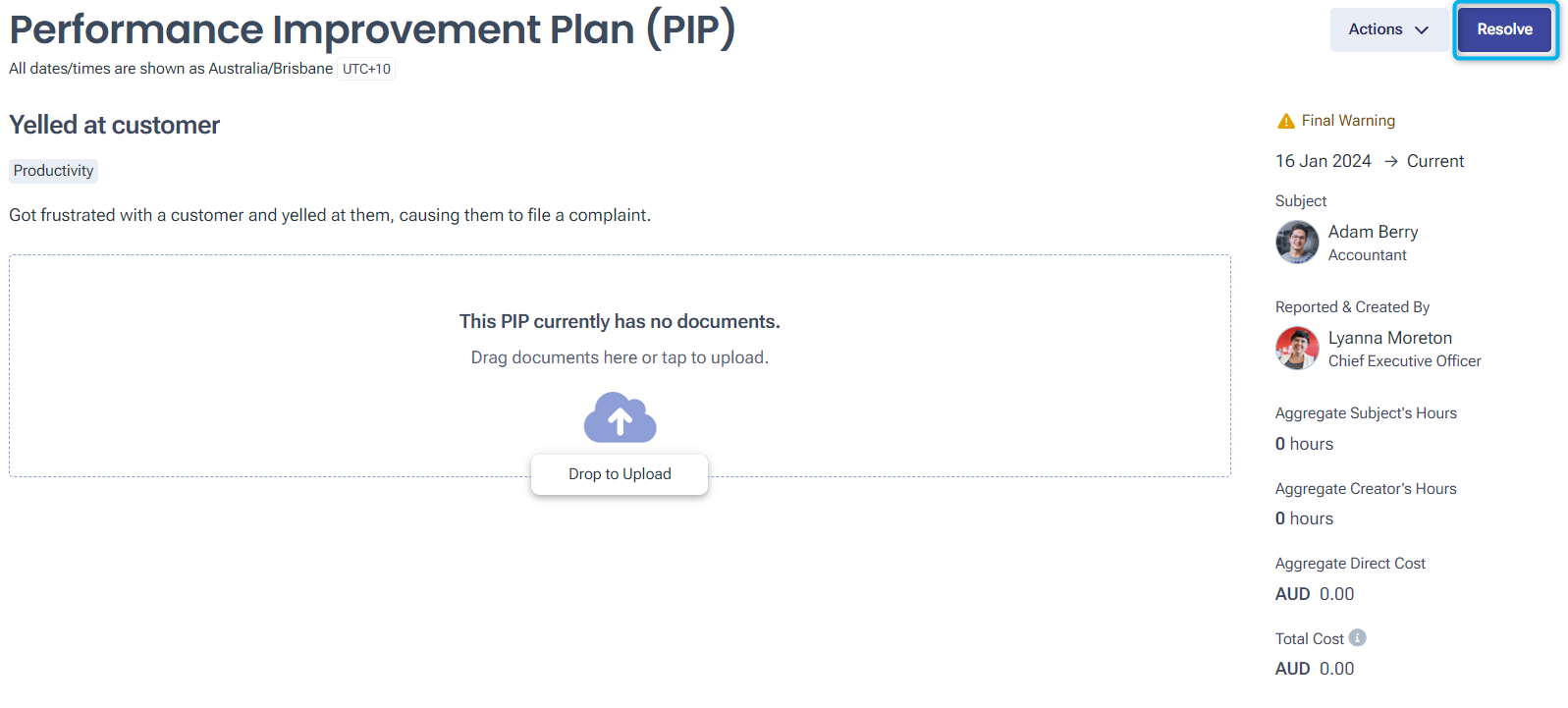 6. Select Resolve to save change to Performance Improvement Plan.